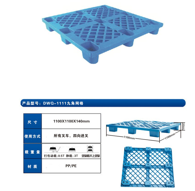 2、九腳塑料托盤產品選用高分子量高密度聚乙烯樹脂,經擠出一次吹塑成型。成型過程快速、充分;產品成型飽滿,內在質量和性能穩定。